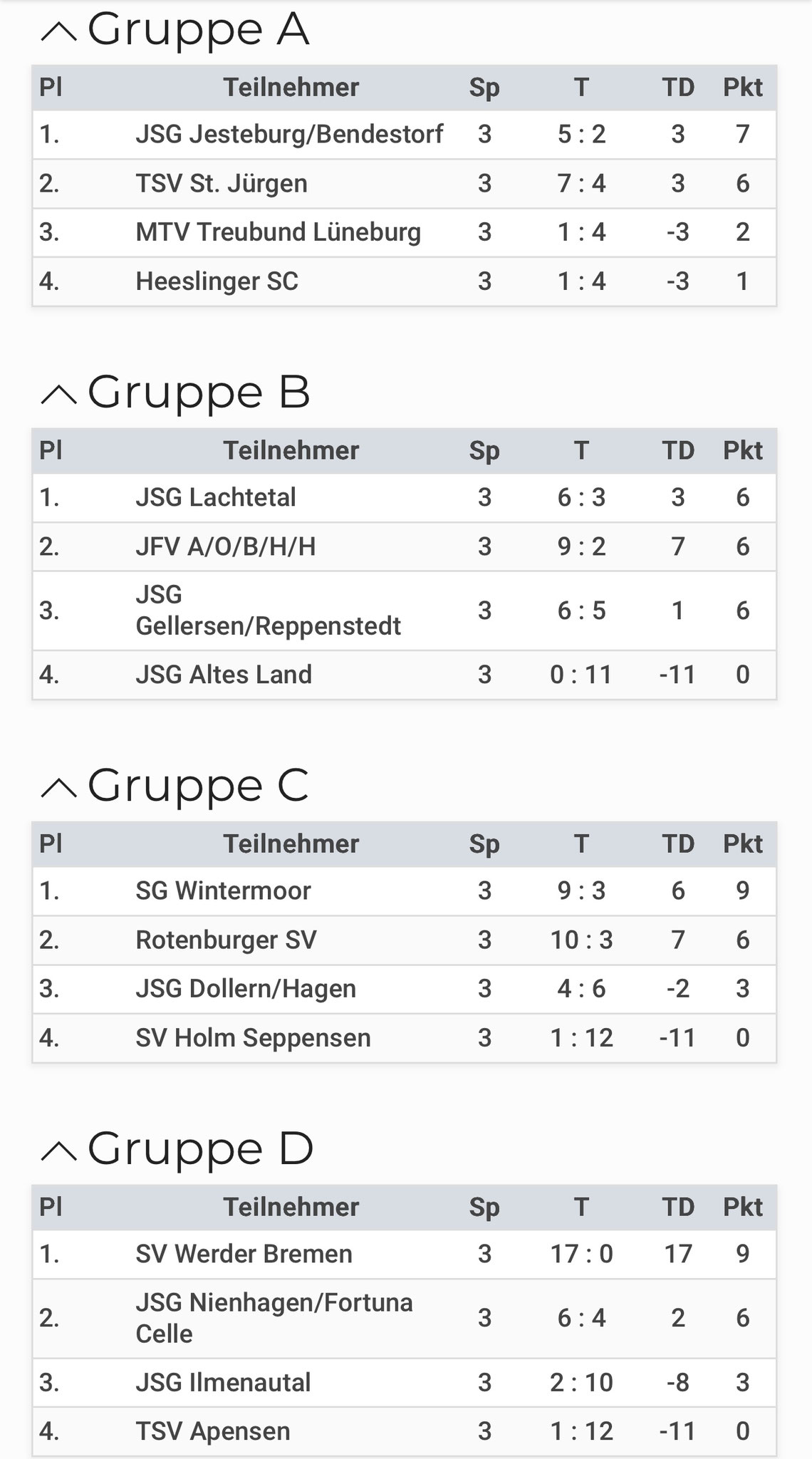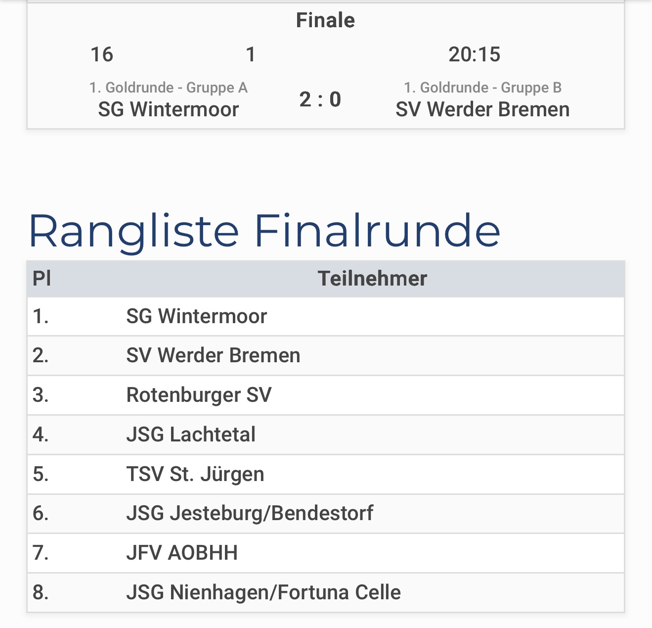 Auch dort ging's stark weiter: Mit 2 Siegen gegen die JSG Lachtetal und JSG Jesteburg/Bendestorf sowie einem Unentschieden gegen JSG Nienhagen/Fortuna Celle zogen wir verdient ins Finale gegen Werder Bremen ein – unser Wunschfinale! 💥
